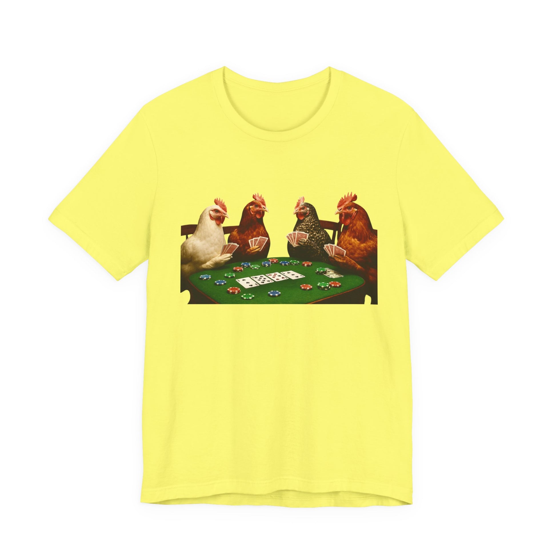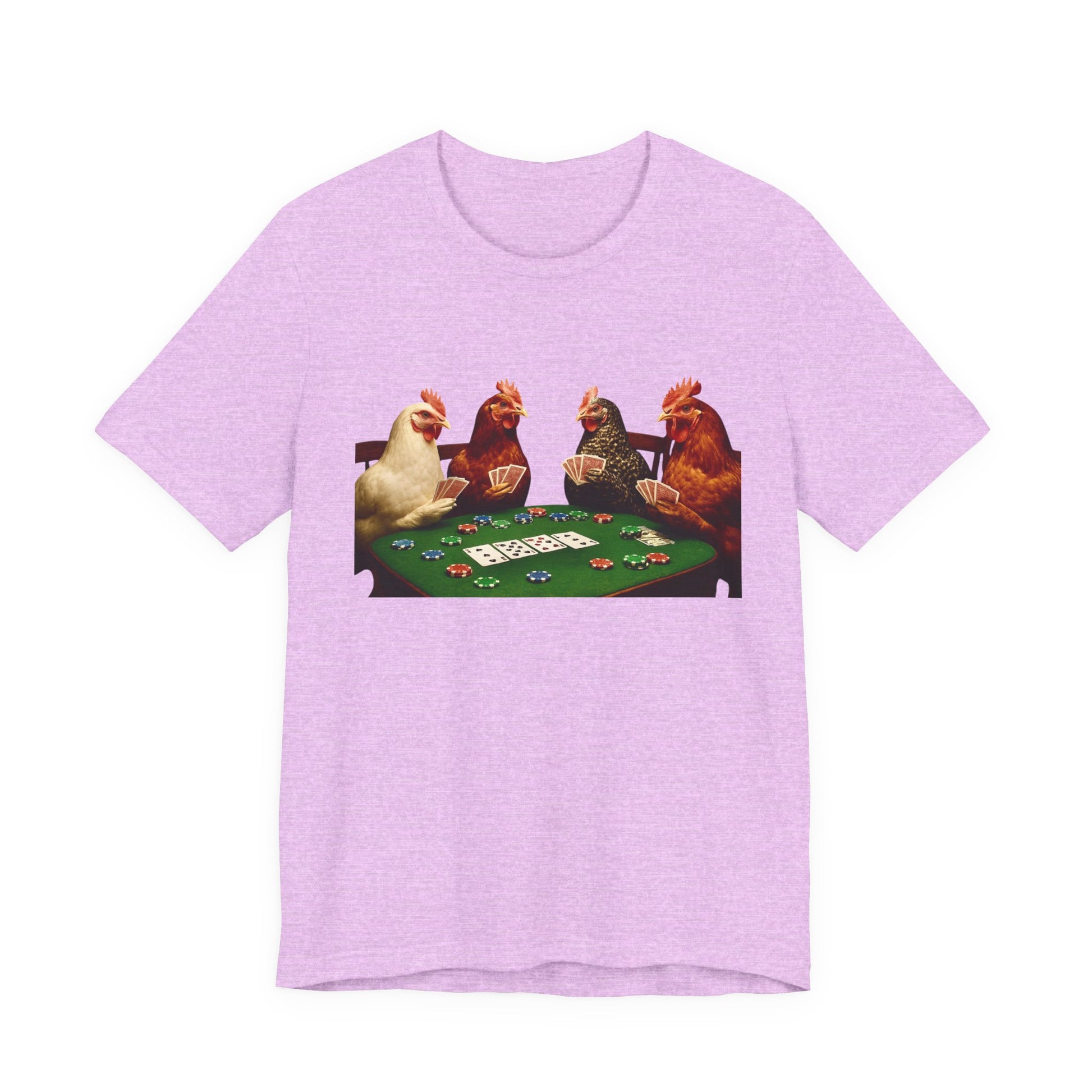 This cotton tee shirt features a design of chickens playing poker, giving off a quirky and playful vibe. It is perfect for casual wear and can be a great conversation starter. Ideal for adults who enjoy unique and humorous designs. Great for casual gatherings, game nights, and fun occasions.