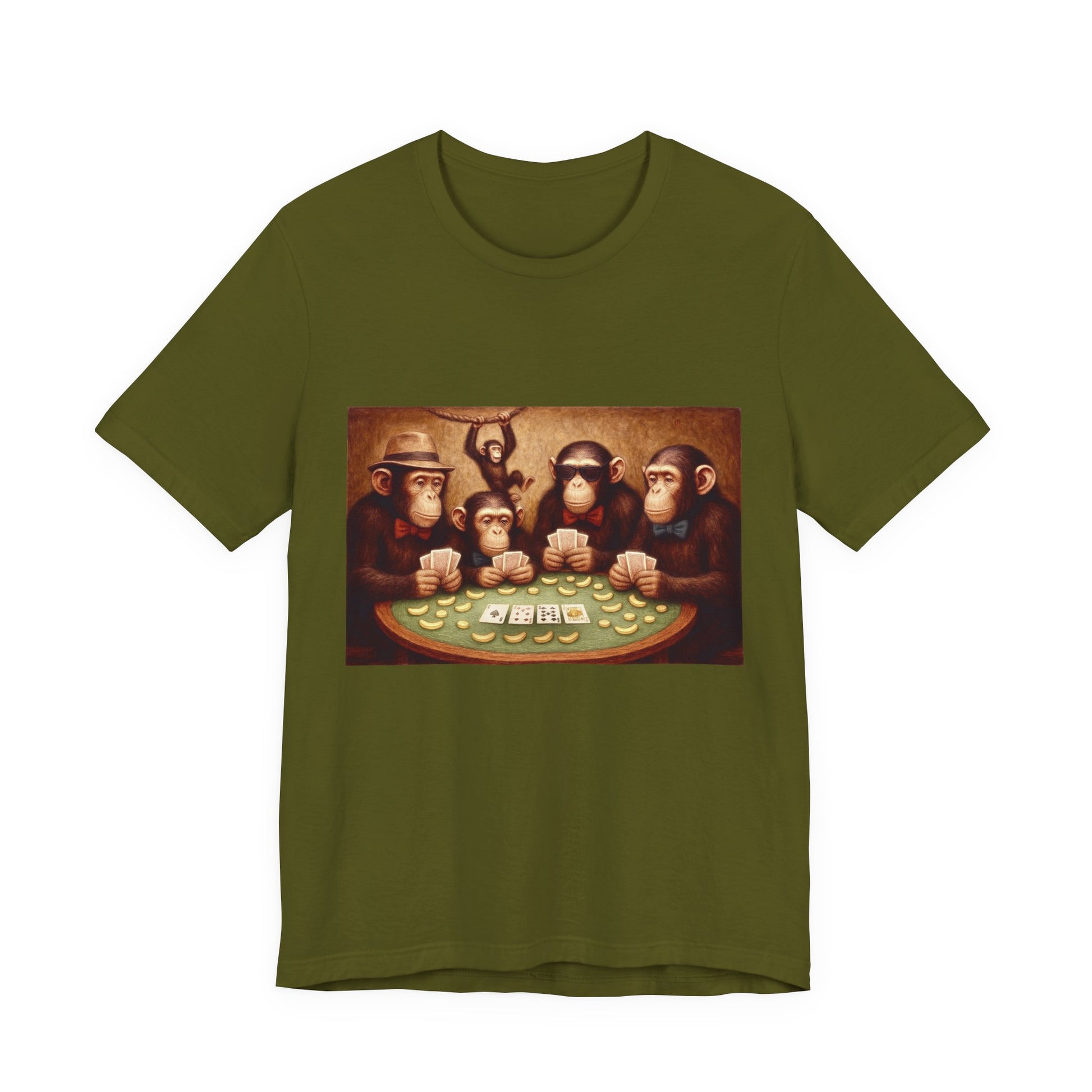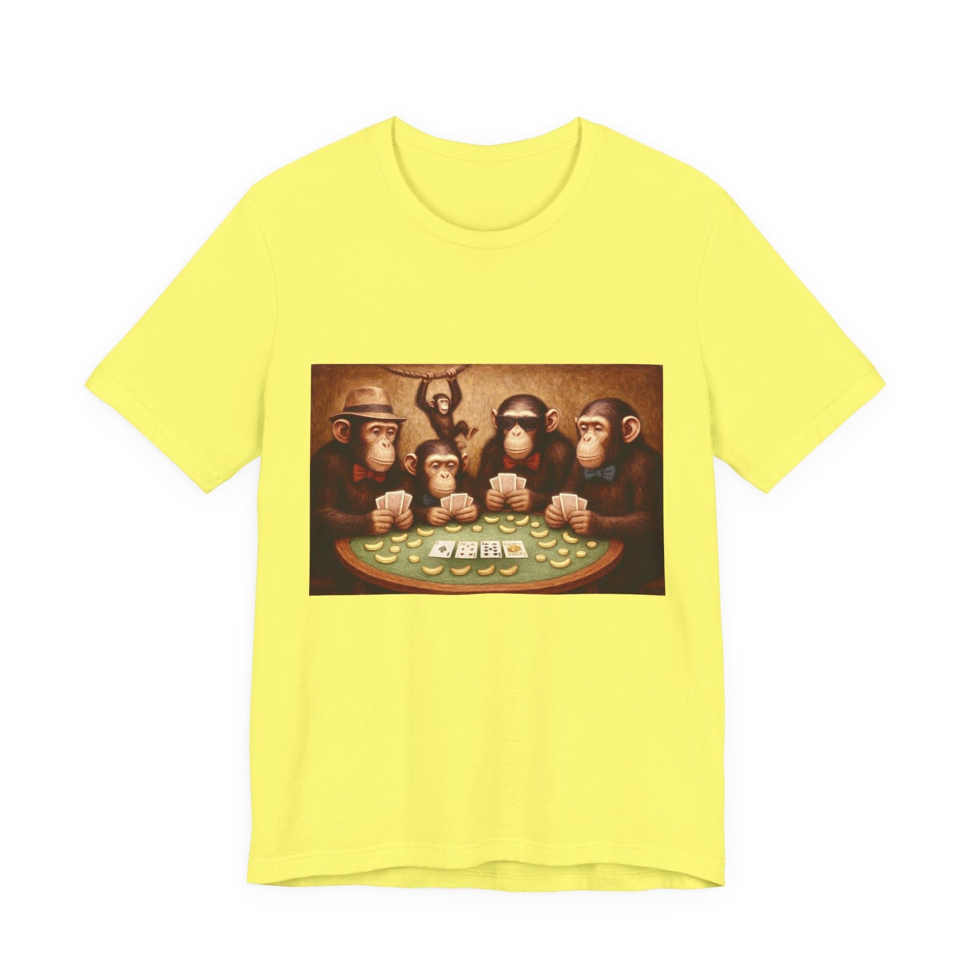 A playful t-shirt featuring chimpanzees playing poker, made with 100% Airlume combed and ring-spun cotton for a lightweight and breathable feel. Perfect for casual wear, this tee is ideal for animal lovers and those with a quirky sense of style. Suitable for casual outings, zoo visits, and game nights with friends.