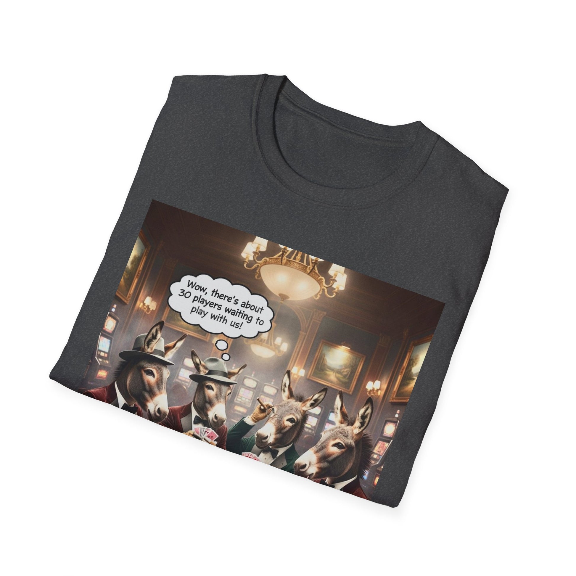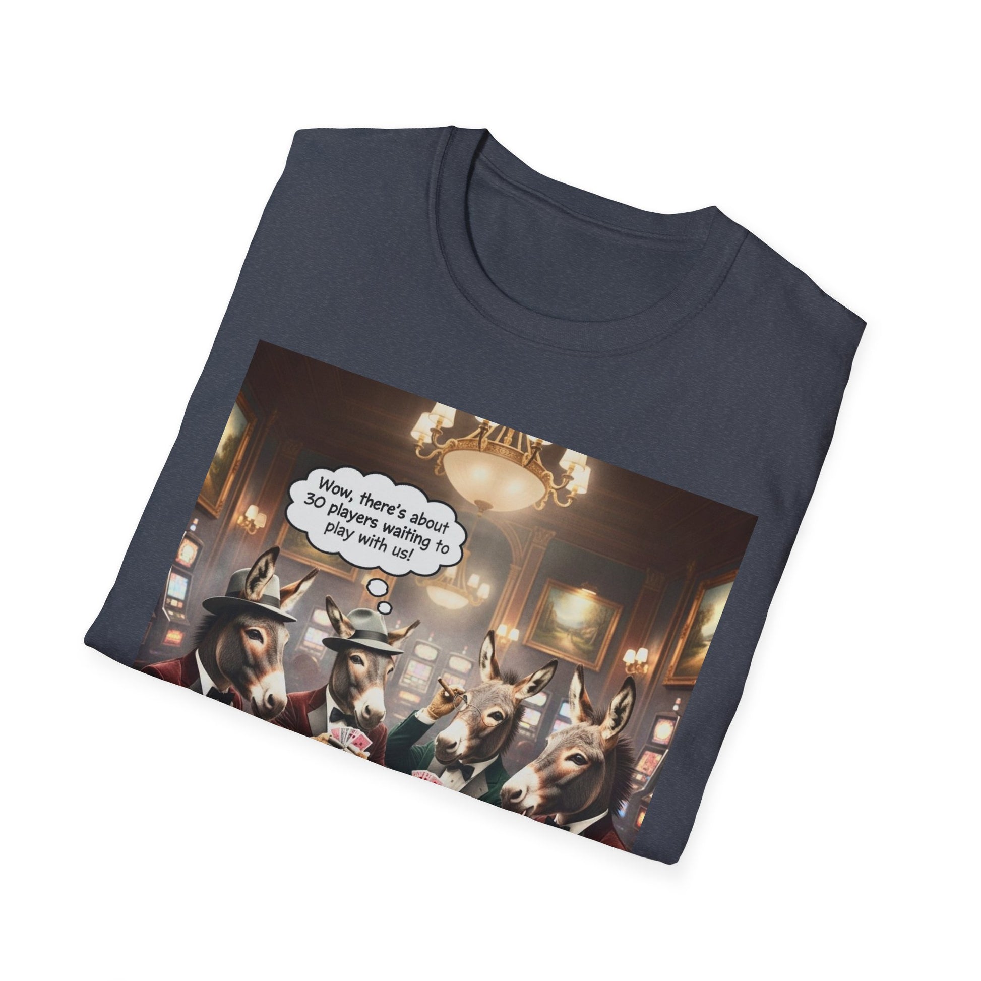 A quirky and playful T-Shirt featuring a design of donkeys playing poker. Perfect for those who enjoy a touch of humor in their wardrobe. Ideal for casual wear and can be a great conversation starter. Relevant for gift-giving during birthdays, holidays, or as a fun novelty item.