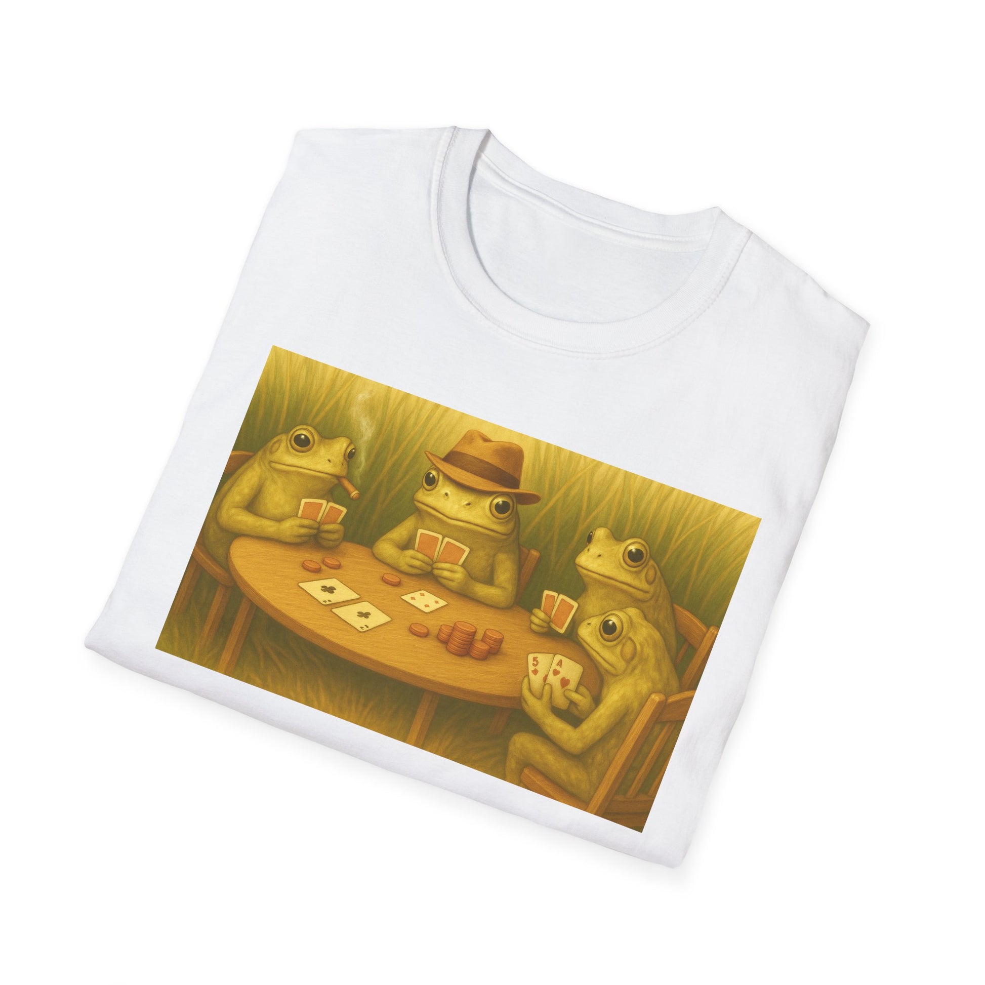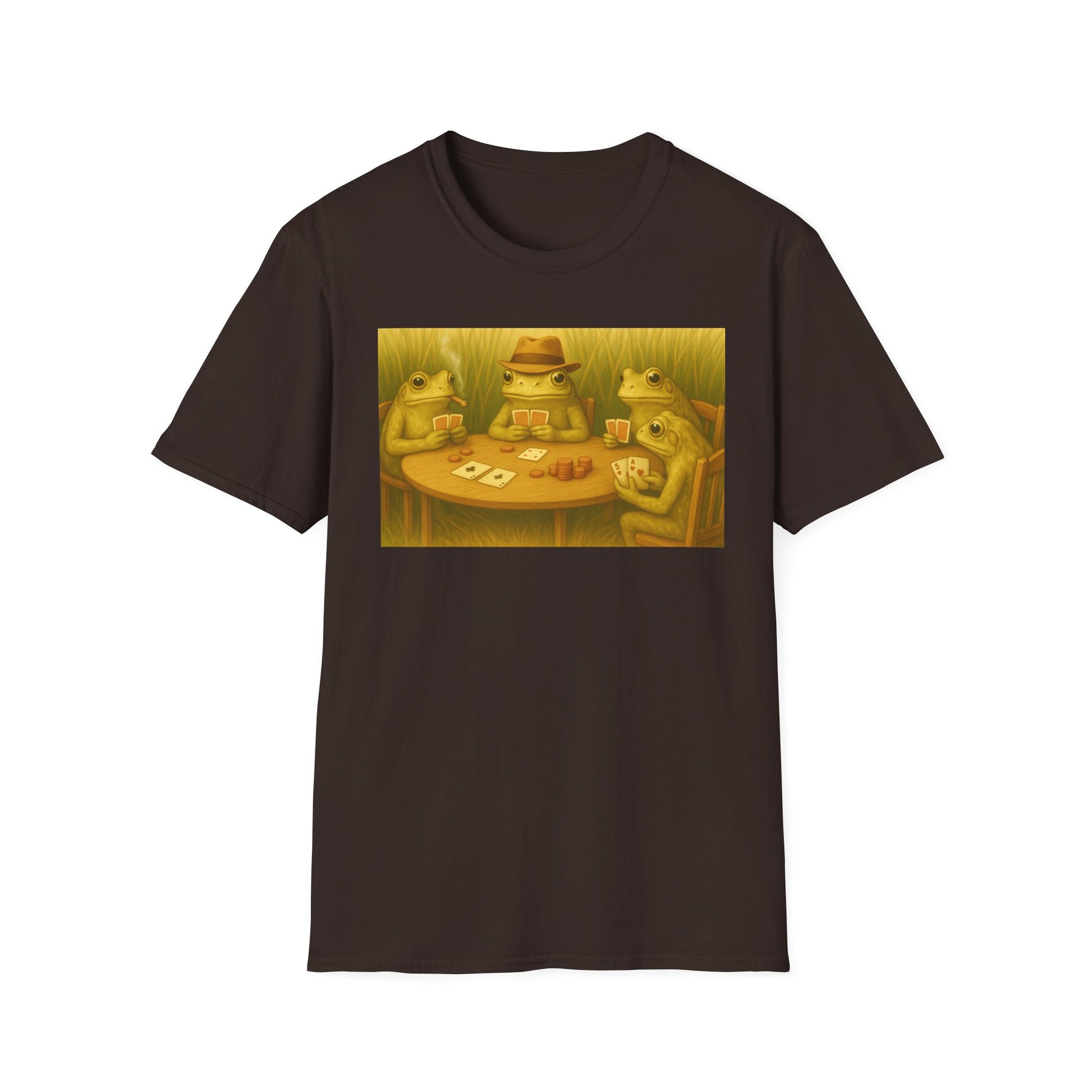 A playful and whimsical T-shirt featuring frogs playing poker, perfect for those who appreciate a touch of humor and fun in their wardrobe. This shirt can add a quirky twist to everyday outfits and is ideal for casual occasions and gatherings. Relevant to those who enjoy unique and lighthearted designs, perfect for gifting on birthdays, holidays, or game nights.