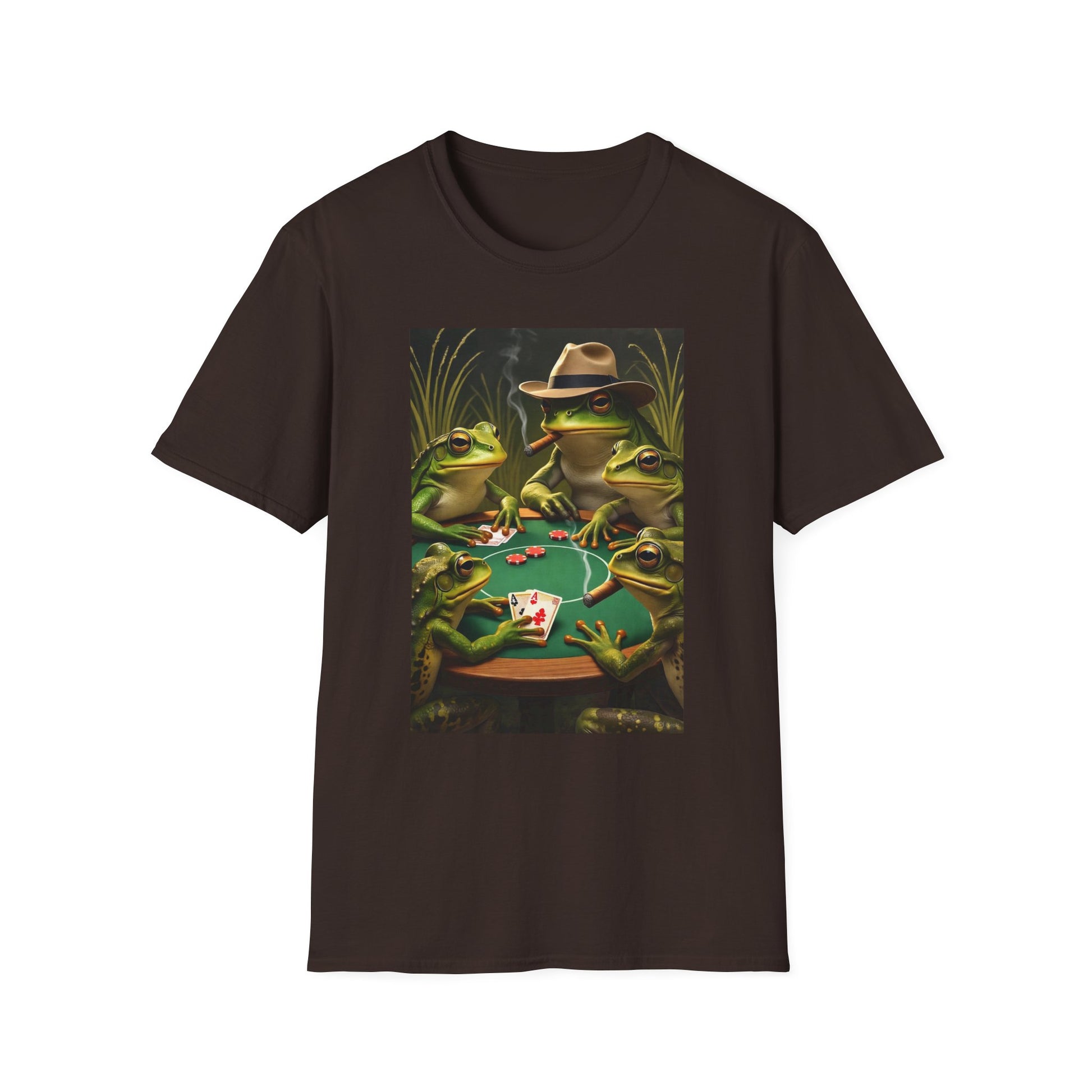 A fun and quirky T-shirt featuring cool frogs playing poker, perfect for casual wear or as a conversation starter. The unisex design is great for adults, making it a versatile addition to any wardrobe. Ideal for themed parties, game nights, or as a unique gift for frog enthusiasts.