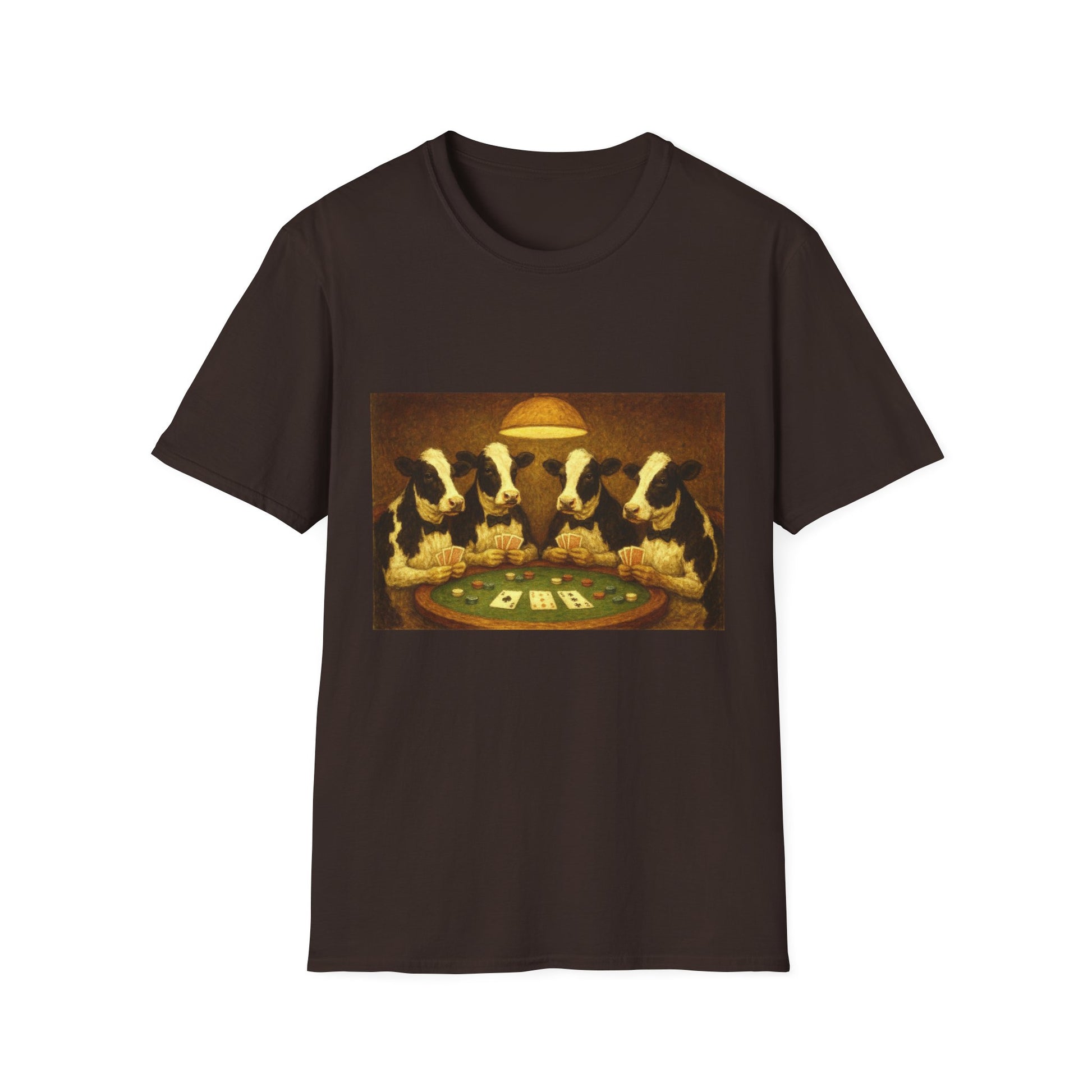 This T-Shirt featuring cows playing poker brings a fun and whimsical vibe to your wardrobe. Perfect for animal lovers, poker enthusiasts, or anyone looking to add a playful touch to their outfit. Ideal for casual wear or as a conversation starter during gatherings and game nights.