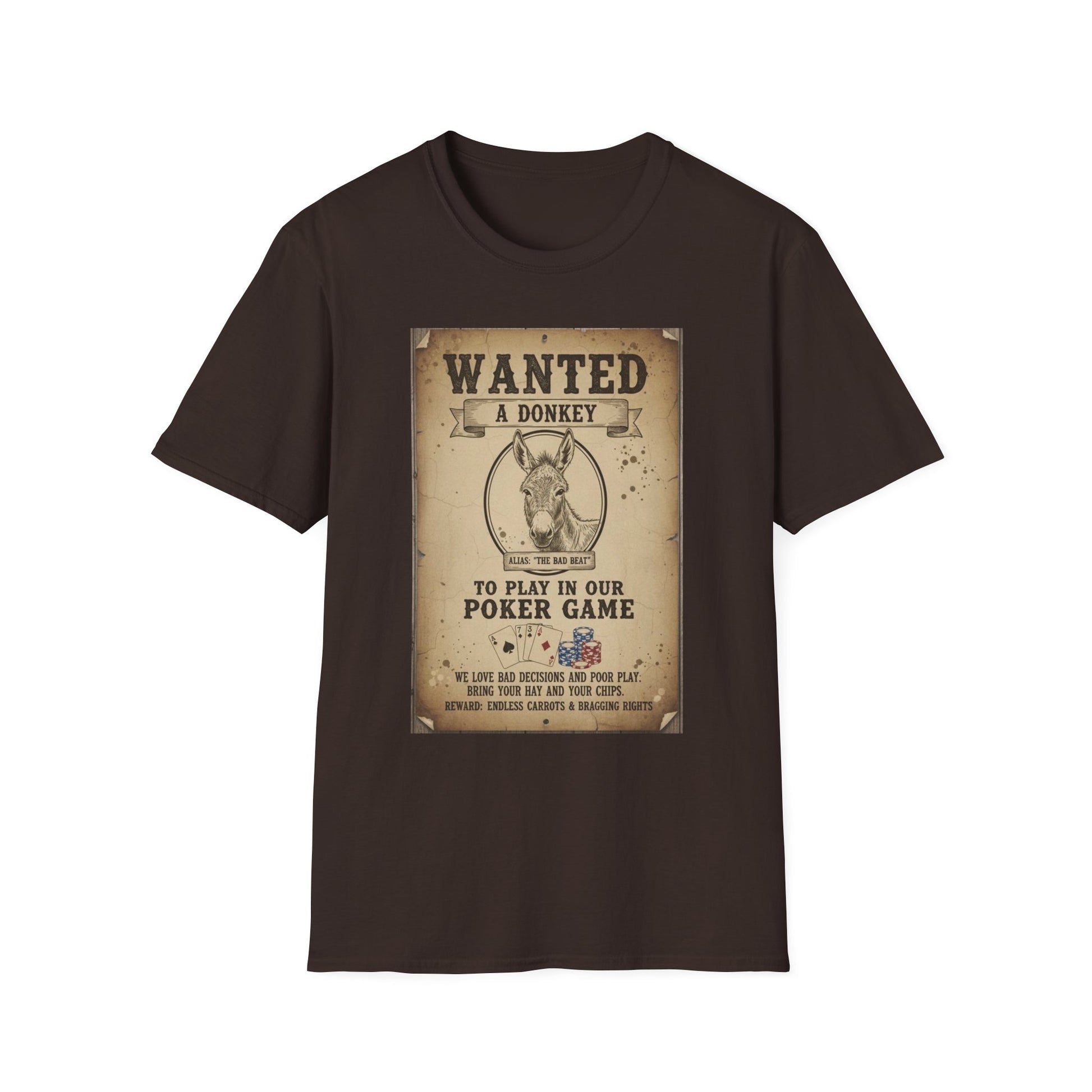 This Wanted Poker Donkey T-Shirt exudes a playful and humorous vibe, perfect for fans of poker or those who appreciate a good joke. It is a great addition to any casual wardrobe and can be worn for everyday occasions or events with friends. Ideal for adults who enjoy wearing unique and quirky graphic tees, this shirt is a fun option for poker nights, game nights, or casual gatherings with a touch of humor.
