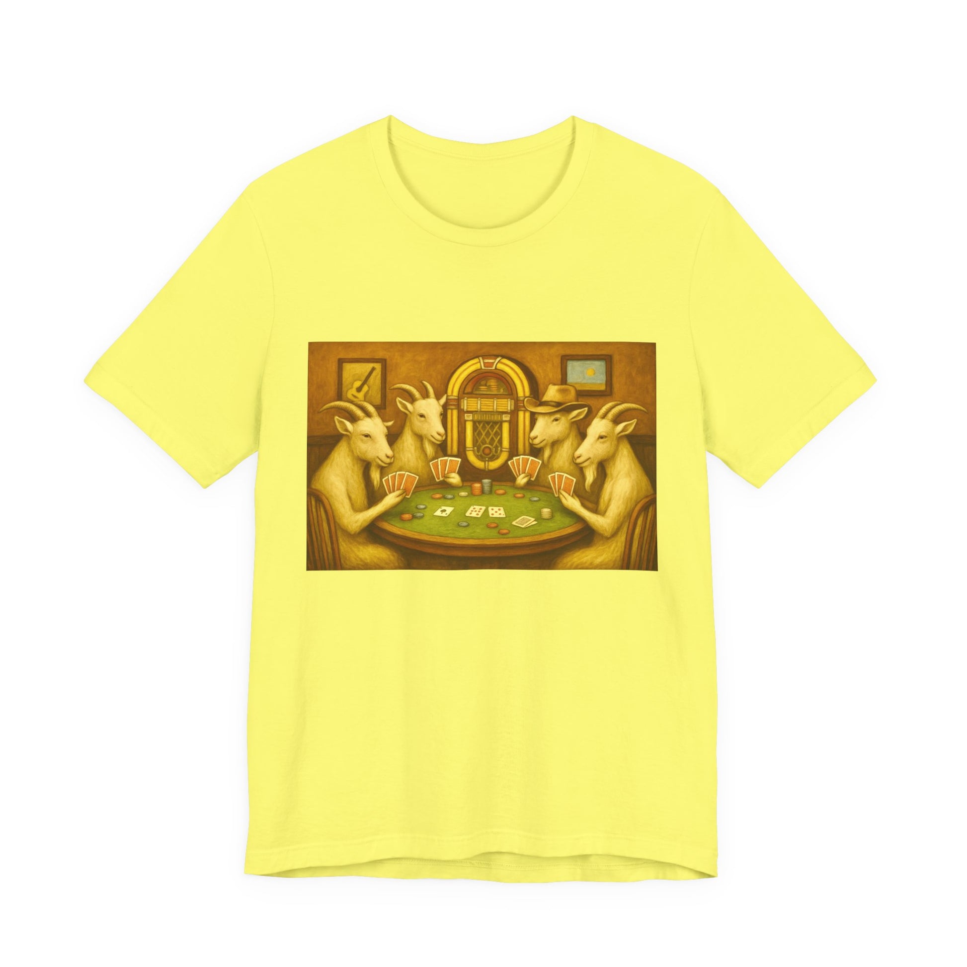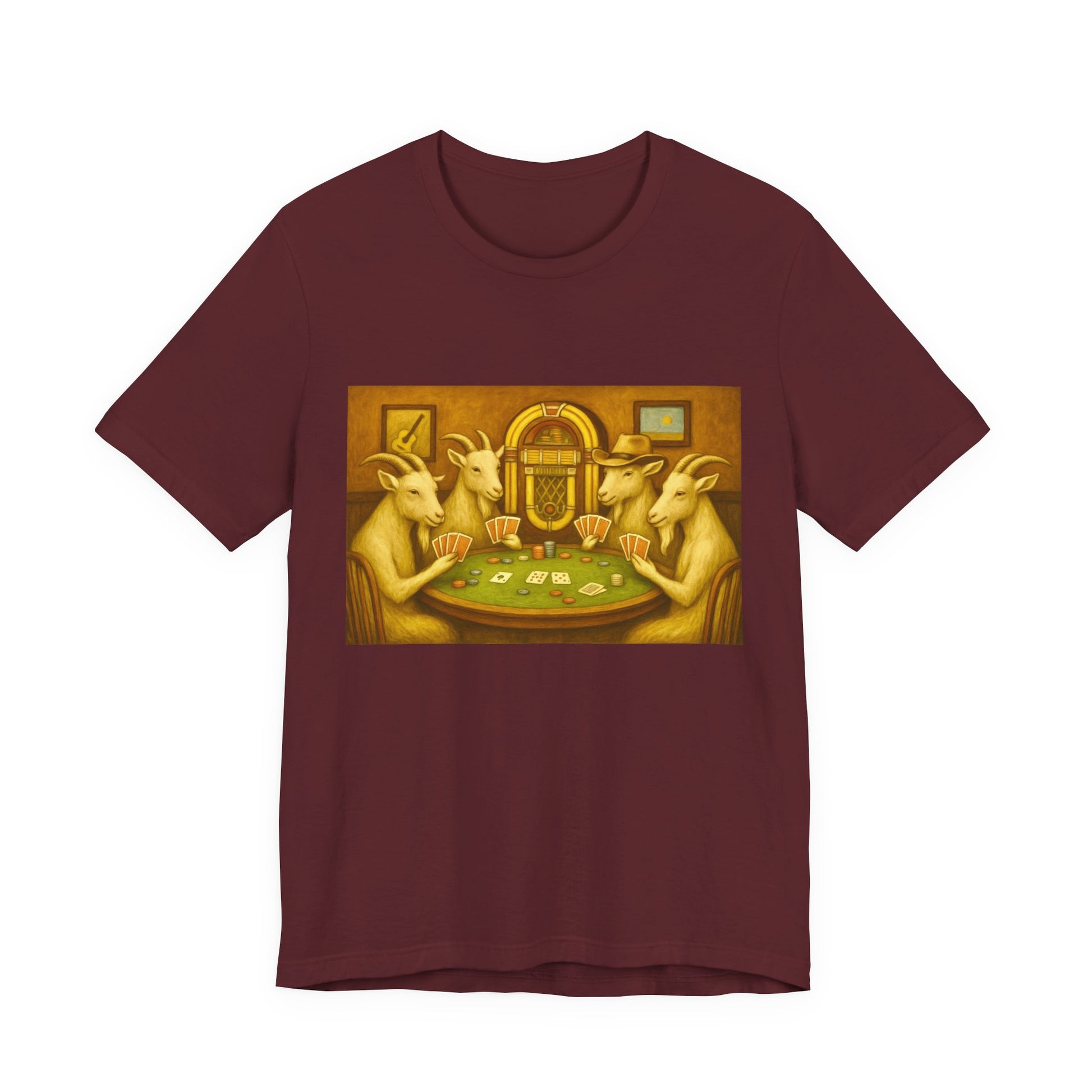 A fun and quirky goats playing poker cotton tee shirt that adds a playful touch to your wardrobe. Perfect for casual outings or lounging around at home. Ideal for animal lovers and those who enjoy unique, humorous designs. Great for gifting during birthdays, holidays, or just because.