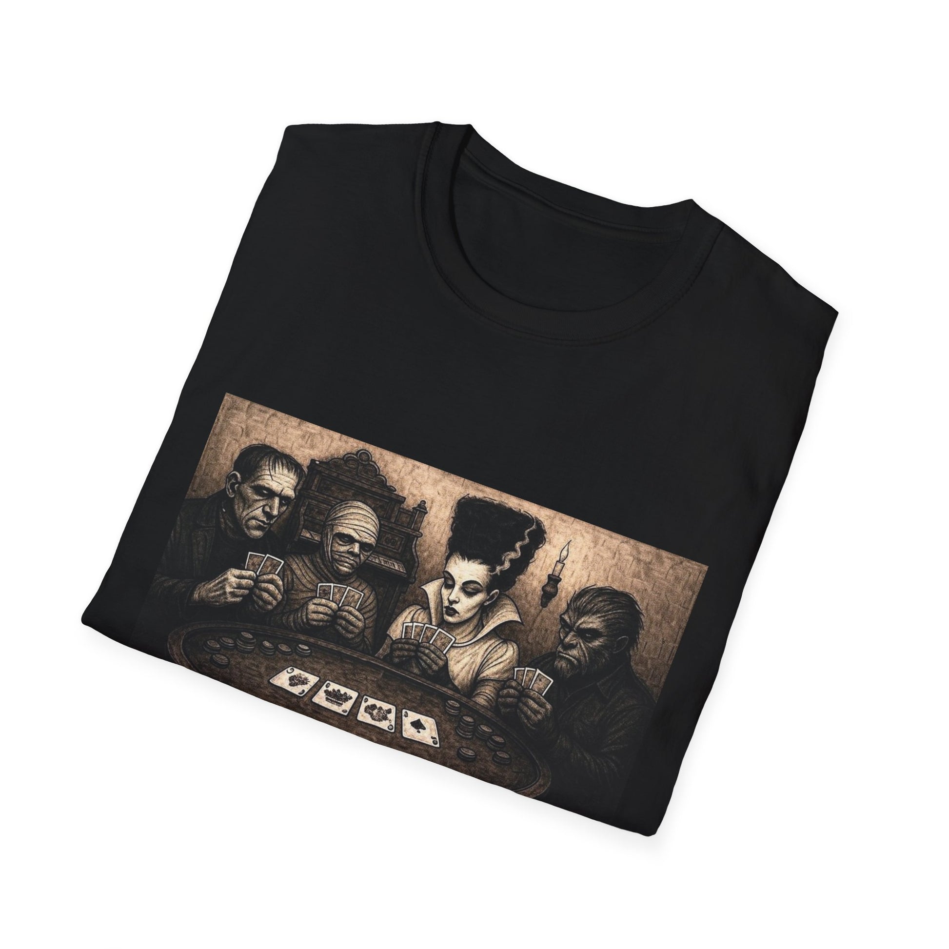 A classic horror-themed T-Shirt featuring iconic characters playing poker, perfect for fans of the genre looking to add a unique and playful twist to their wardrobe. This T-Shirt is relevant for Halloween, horror movie enthusiasts, and fans of classic characters.