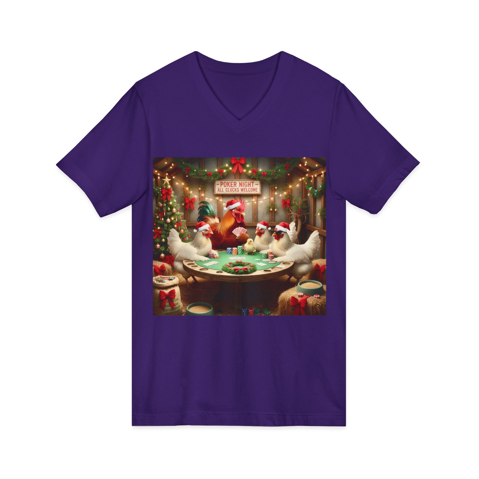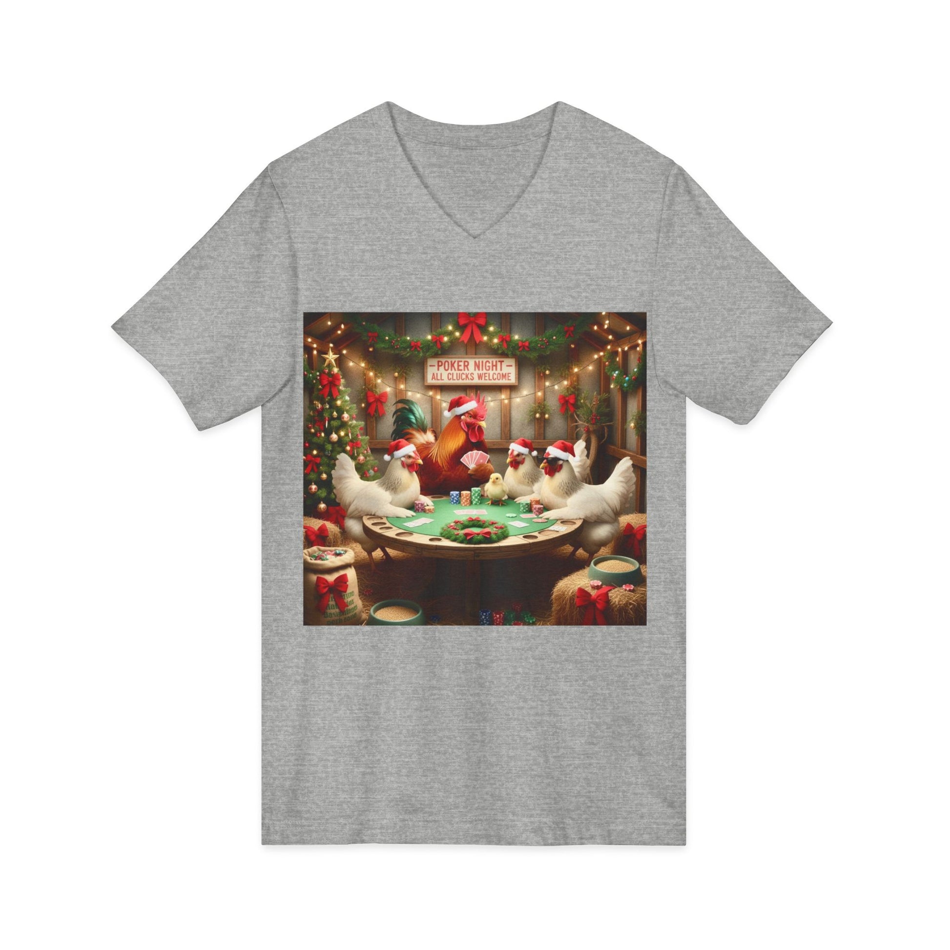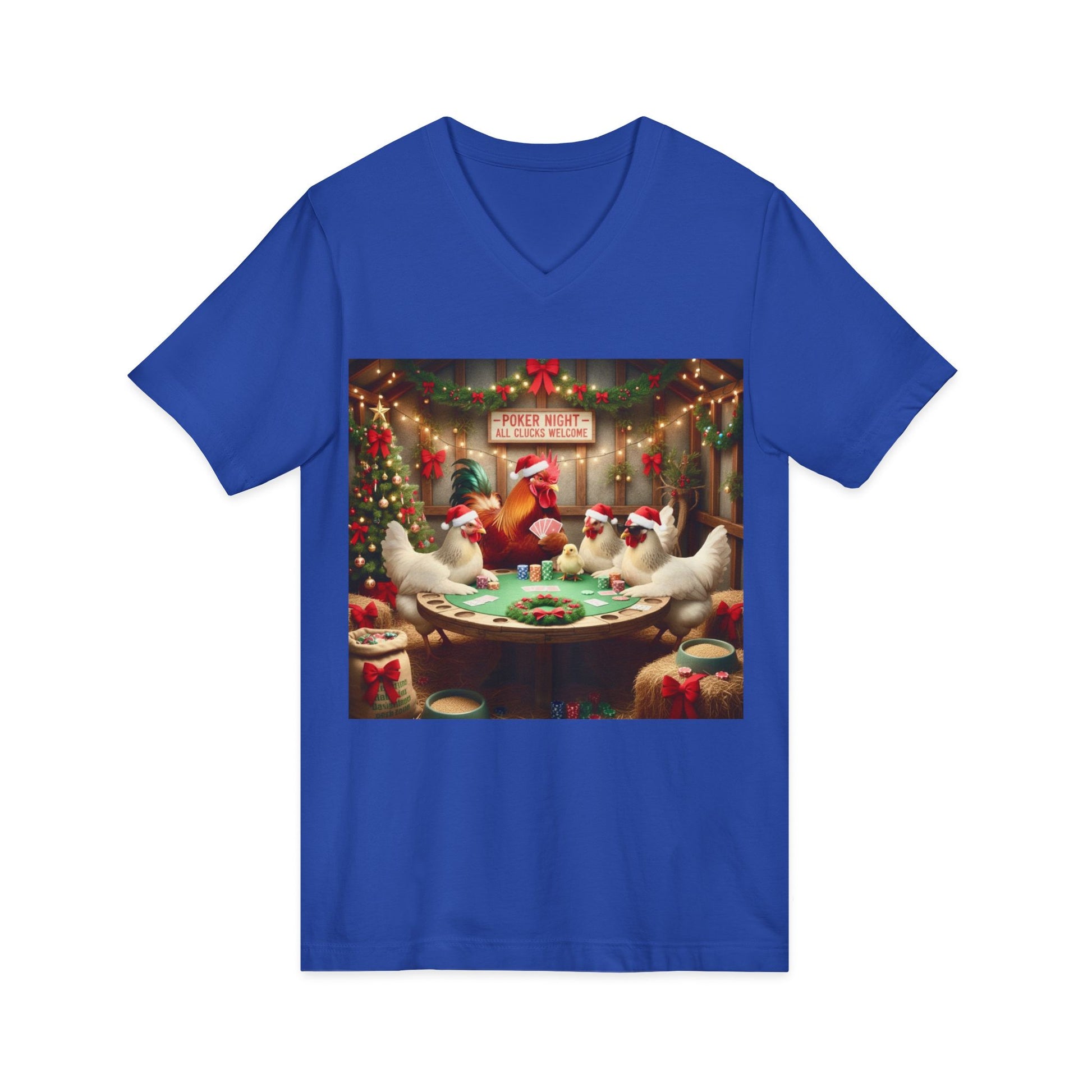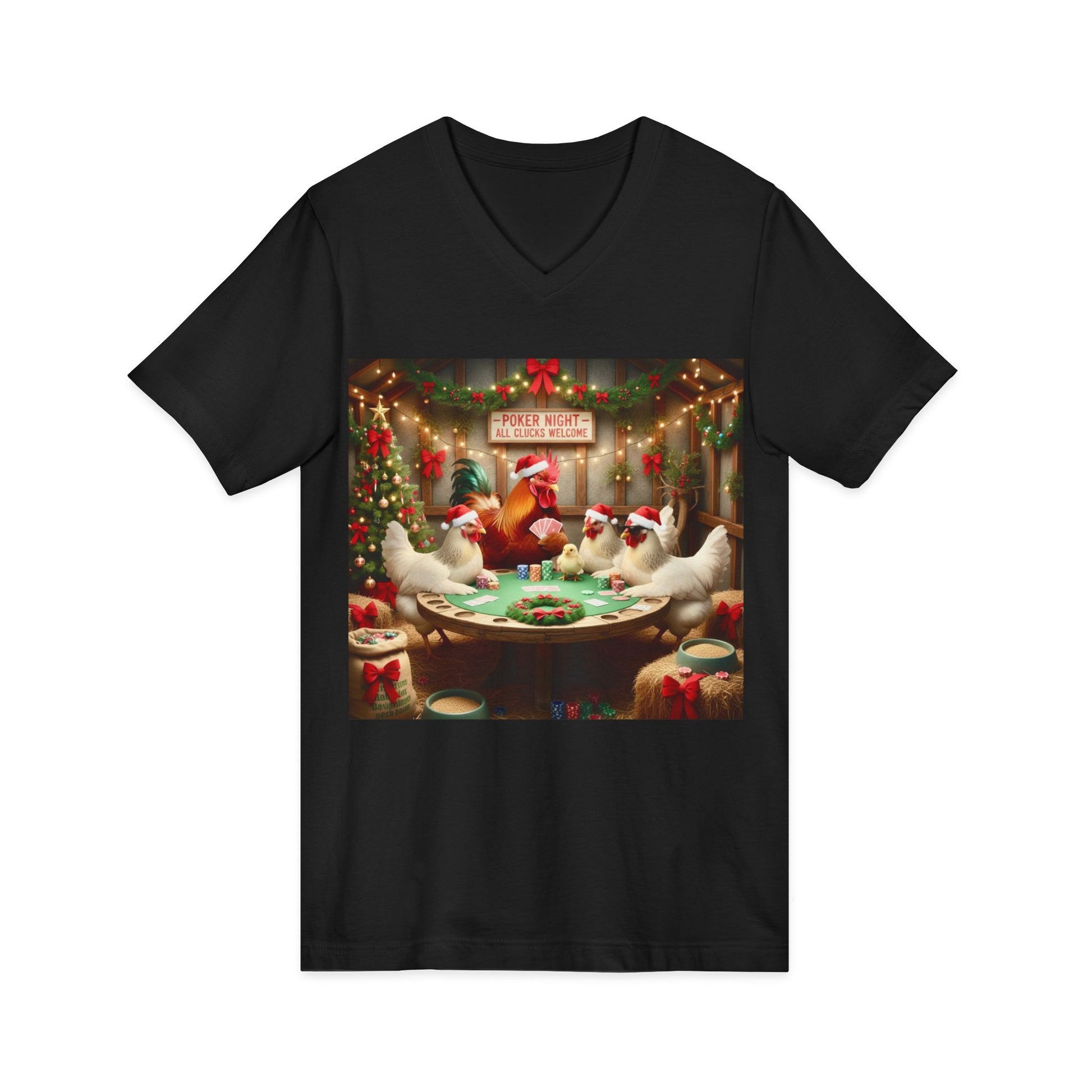 This unique T-Shirt features an amusing design of Santa Chickens playing poker, perfect for bringing some fun and humor into your wardrobe. It is a great conversation starter and a playful addition to any casual outfit. Ideal for those who enjoy quirky and festive designs, this T-Shirt is relevant to Christmas and holiday-themed celebrations.