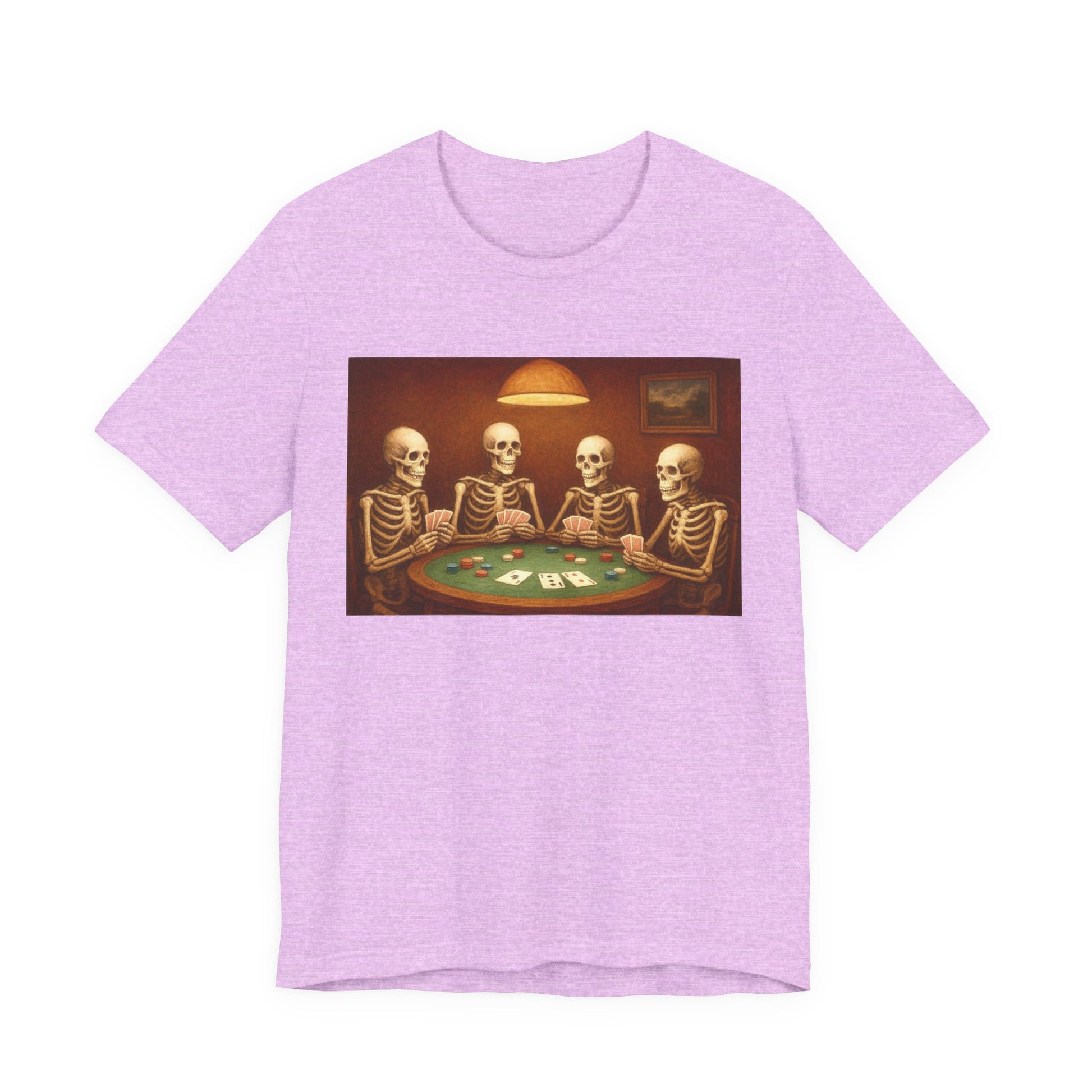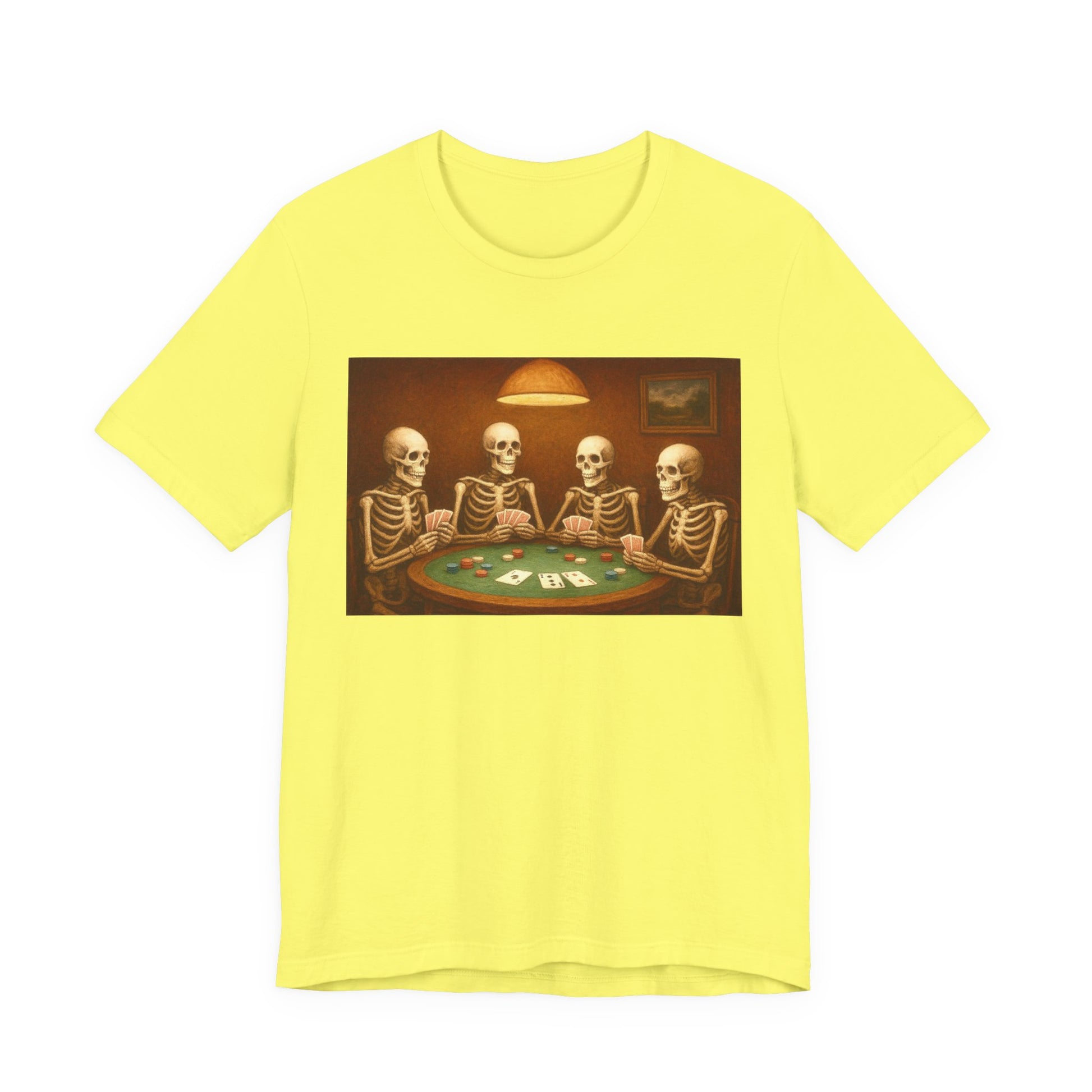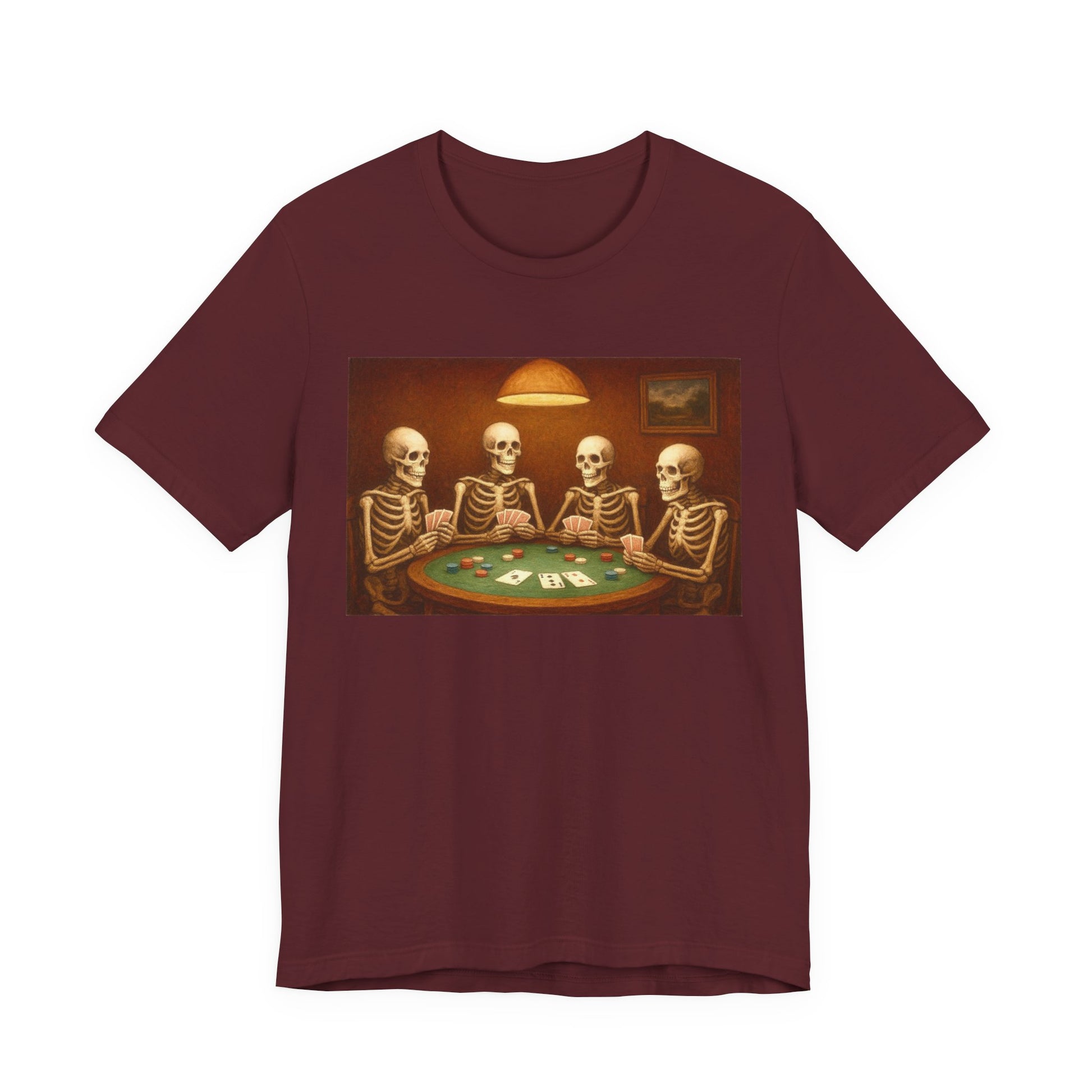 A playful and unique cotton tee featuring a design of skeletons playing poker. This tee exudes a quirky and fun vibe, perfect for casual wear or as a conversation starter. Ideal for those who appreciate dark humor or eclectic style. Relevant for Halloween, Day of the Dead, and themed parties.