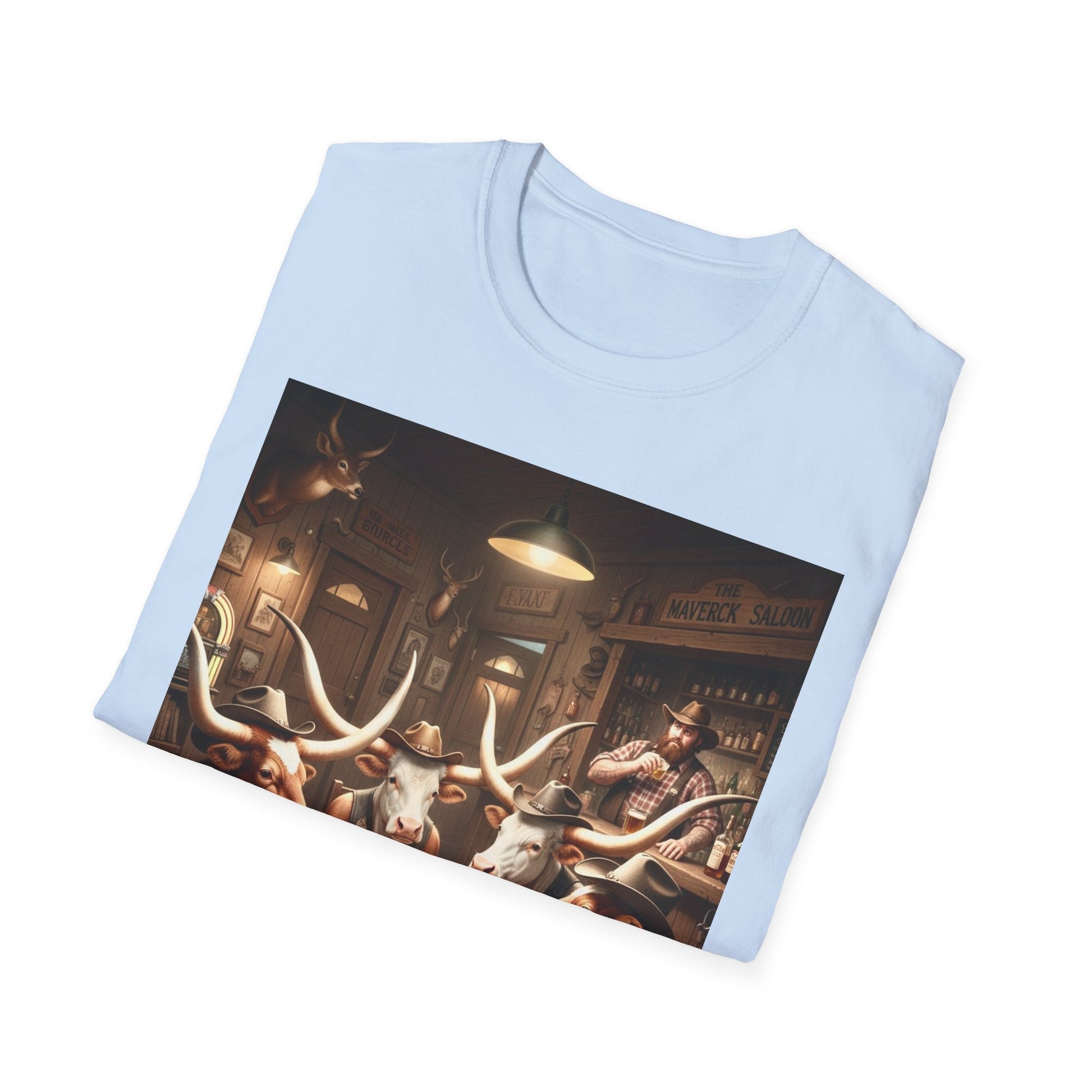 A unique Texas longhorn cows playing poker design on a comfortable and durable unisex softstyle T-shirt. Perfect for animal lovers, Texas enthusiasts, and poker players. Ideal for casual wear, gifting, and themed events like rodeos, cowboy parties, and game nights.