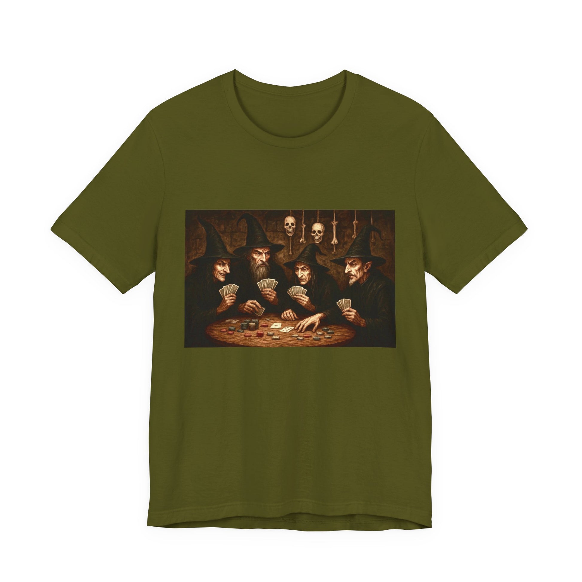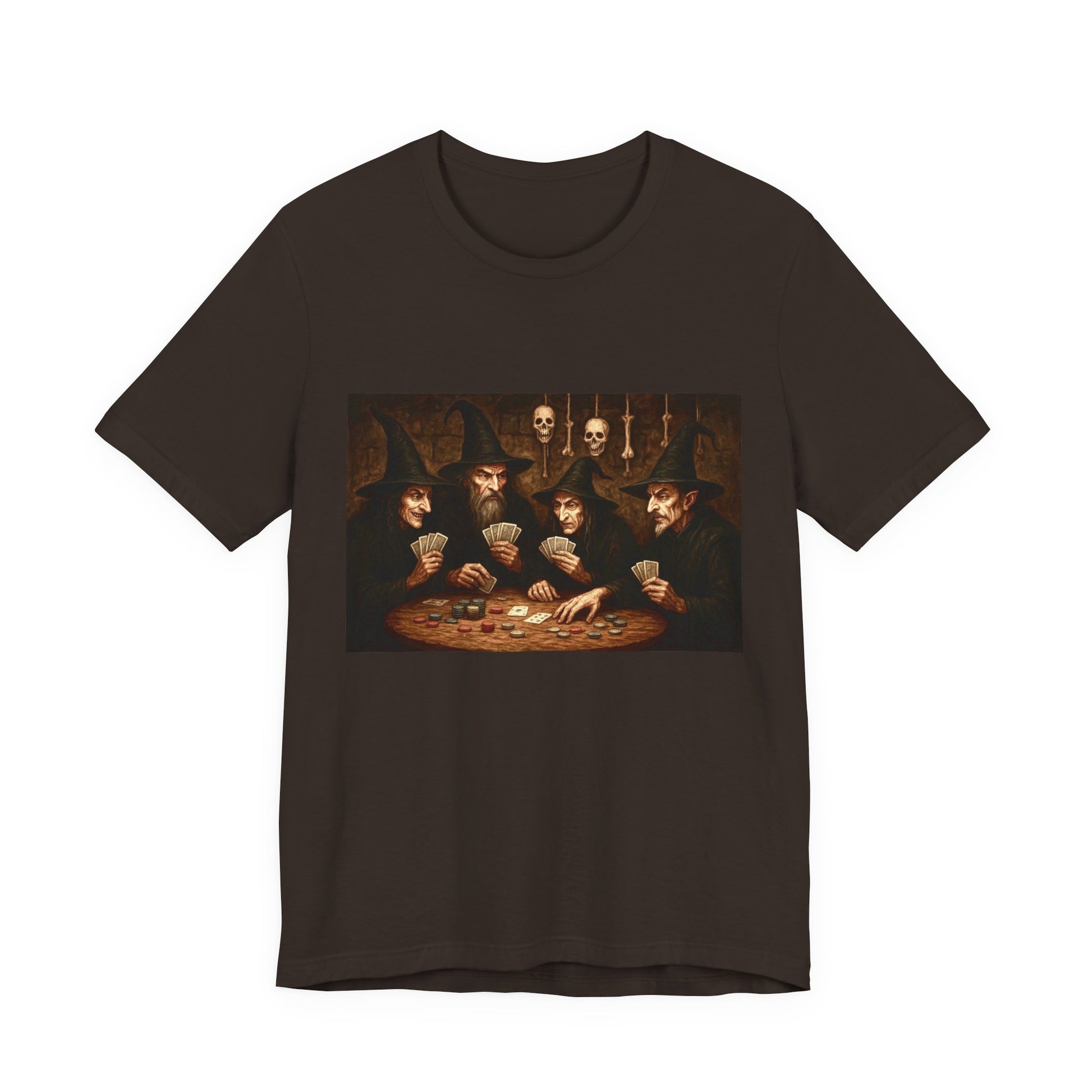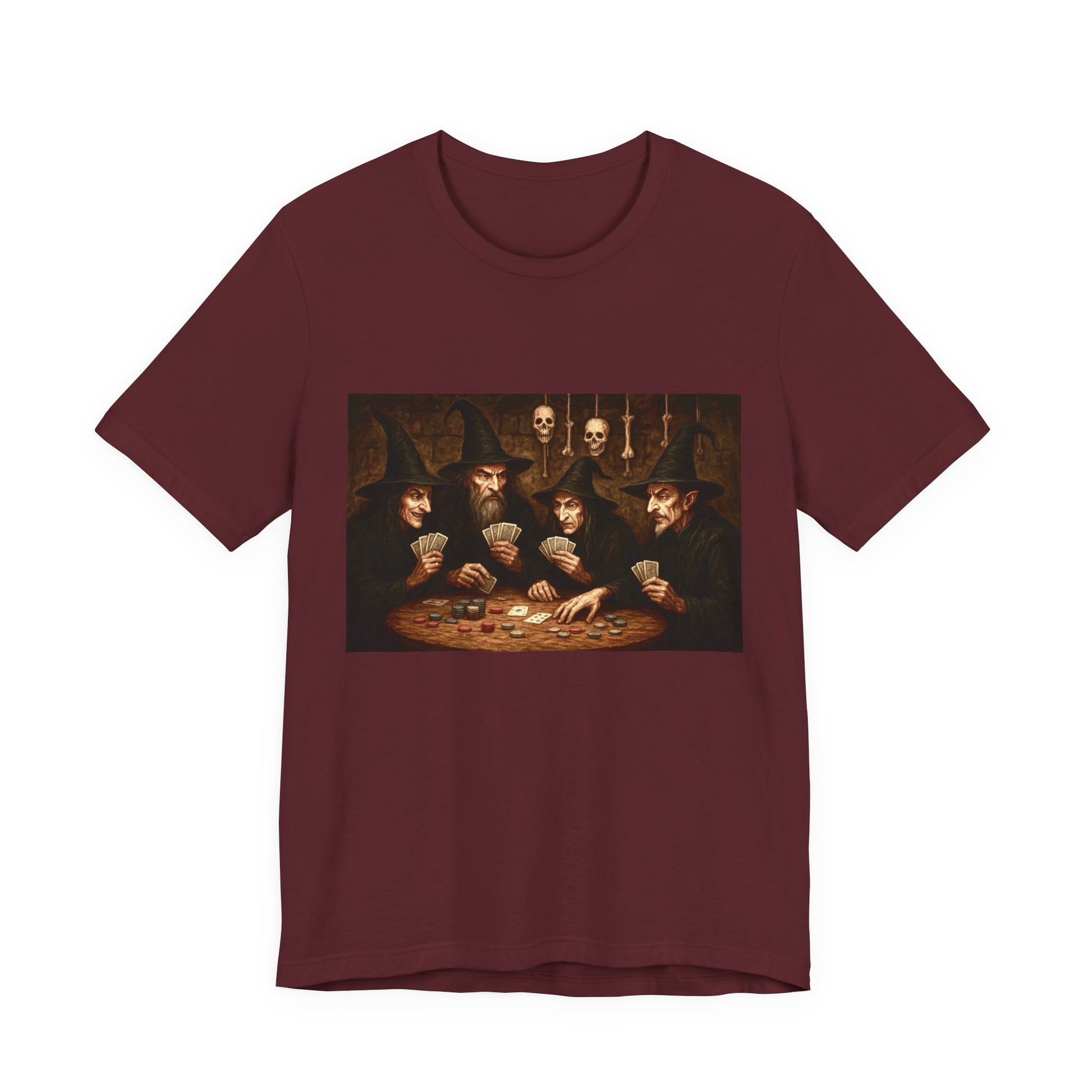 A cotton tee shirt featuring a playful design of witches and warlocks playing poker. Perfect for those who love mystical themes and enjoy a bit of humor in their wardrobe. Ideal for Halloween, cosplay events, and fans of fantasy genres.