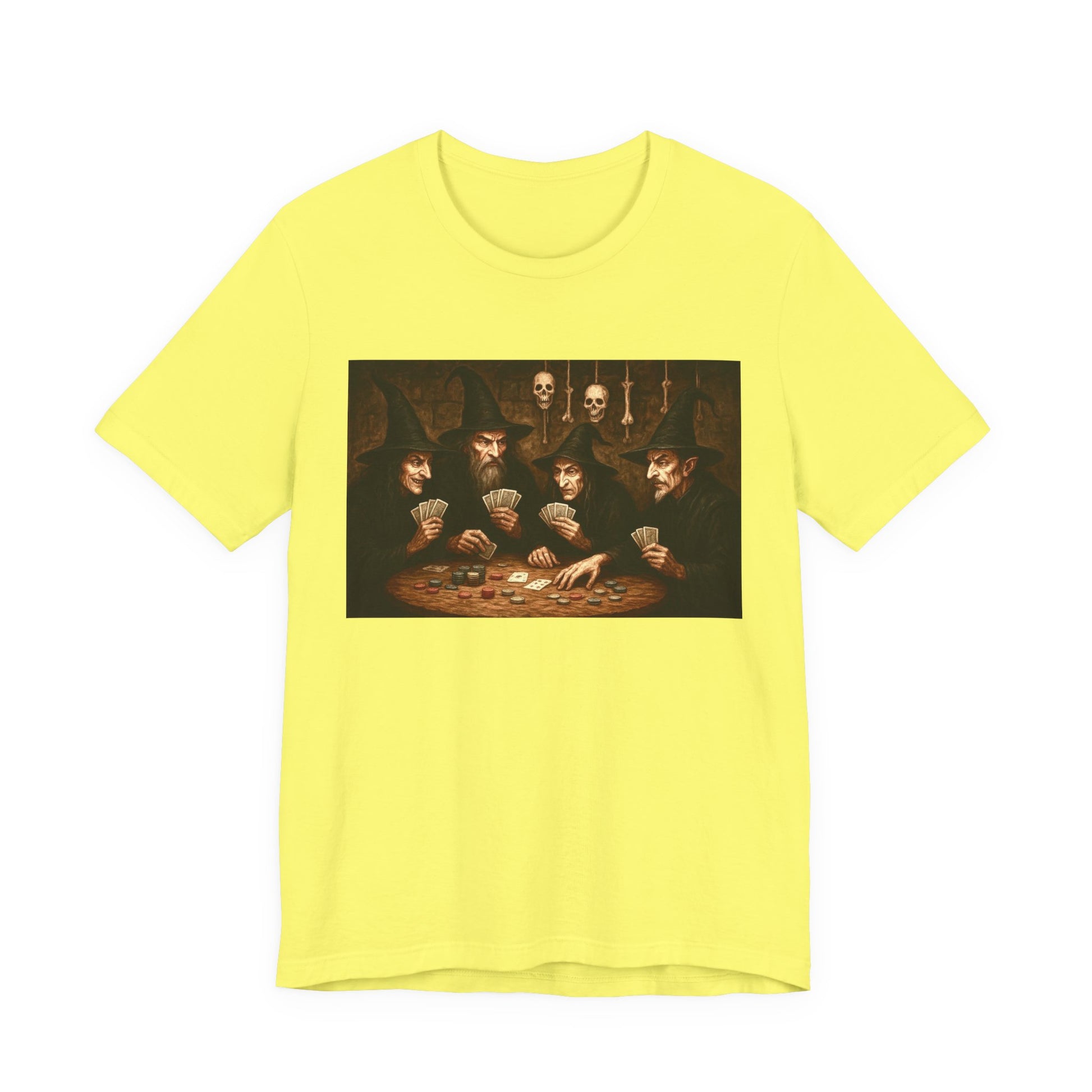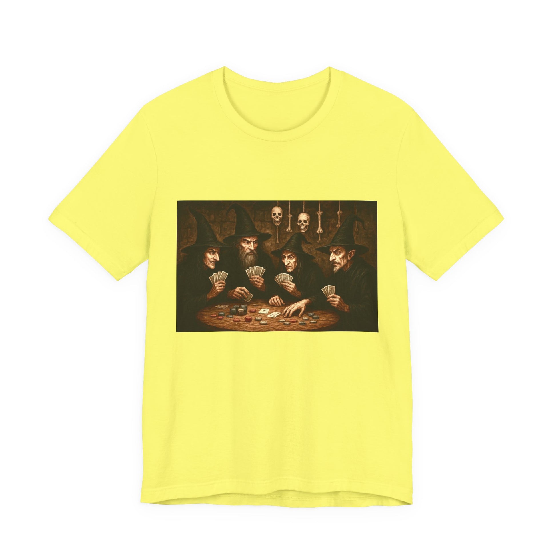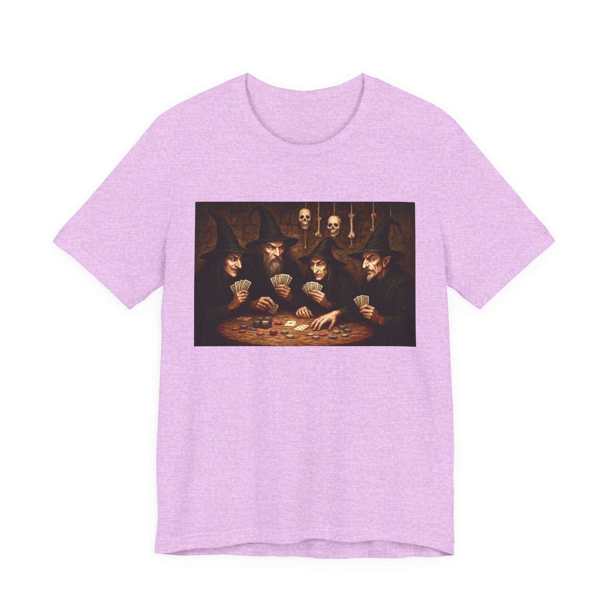 A cotton tee shirt featuring a playful design of witches and warlocks playing poker. Perfect for those who love mystical themes and enjoy a bit of humor in their wardrobe. Ideal for Halloween, cosplay events, and fans of fantasy genres.